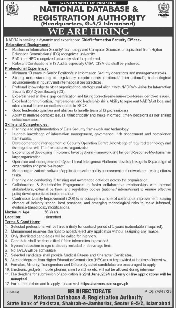 The National Database & Registration Authority (NADRA) is inviting applications from experienced and dynamic professionals for the position of Chief Information Security Officer (CISO). NADRA is seeking individuals who can steer the organization’s information security and cyber security strategies, aligning them with NADRA’s vision to ensure robust and resilient security frameworks.