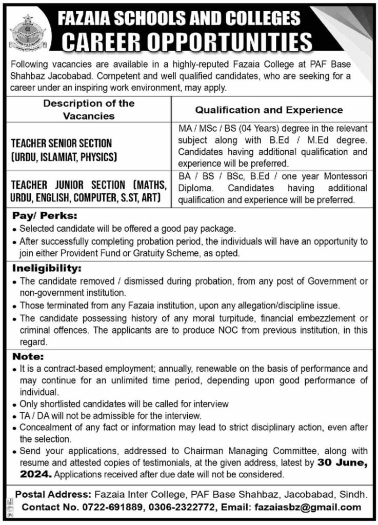 Fazaia Schools and Colleges at PAF Base Shahbaz, Jacobabad, offer a unique opportunity to be part of a prestigious educational institution. With competitive pay packages, growth opportunities, and a supportive work environment, this is the perfect place for dedicated educators. If you meet the qualifications and are passionate about teaching, we encourage you to apply.
