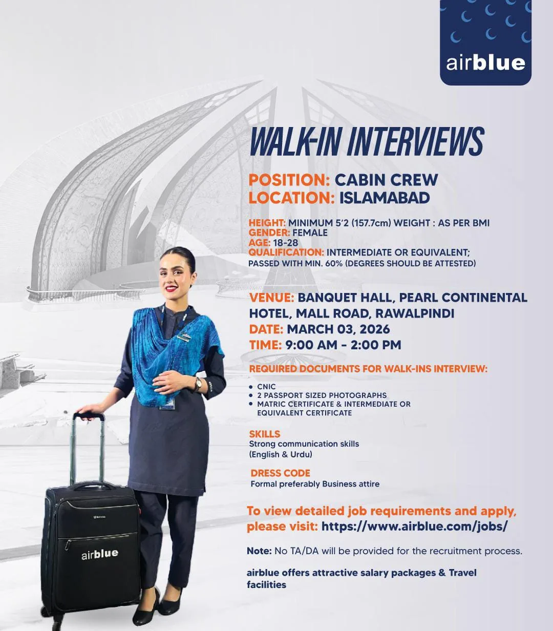 While the primary recruitment is through walk-in interviews, candidates are also encouraged to view detailed job requirements and create a profile on the official Airblue careers portal: