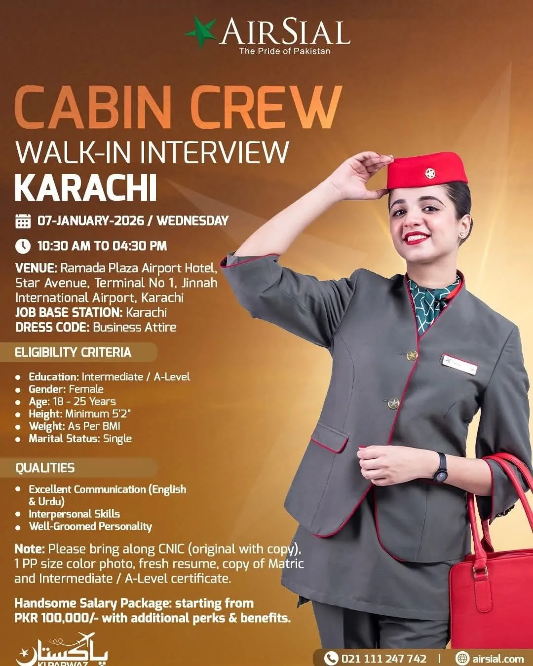 The AirSial Cabin Crew Walk-In Interview Karachi 2026 is a golden opportunity for eligible female candidates to start a rewarding career in aviation. With a strong salary package, growth opportunities, and a respected airline brand, AirSial continues to attract top talent across Pakistan.