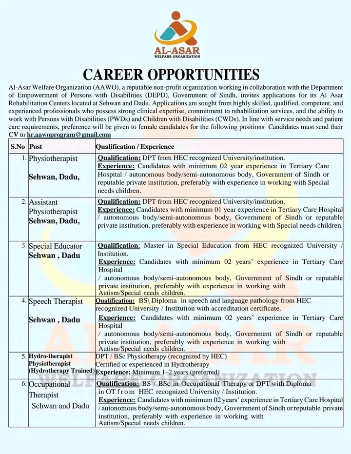 The Al-Asar Welfare Organization (AAWO), a leading non-profit organization dedicated to empowering persons with disabilities, has announced a series of high-impact career opportunities for 2026. Working in close collaboration with the Department of Empowerment of Persons with Disabilities (DEPD), Government of Sindh, AAWO is seeking passionate and qualified professionals for its Al-Asar Rehabilitation Centers located in Sehwan and Dadu.