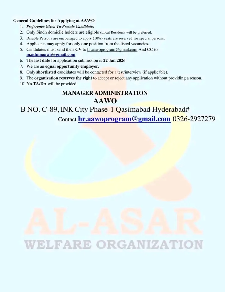 For further queries regarding Al-Asar Welfare Organization Jobs 2026, you can contact the Manager Administration at their Hyderabad office: