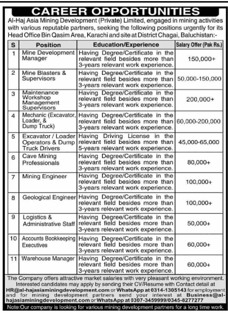Al-Haj Asia Mining Development (Private) Limited is at the forefront of the mining industry, partnering with various reputable organizations to drive excellence in mining activities. We are seeking highly qualified and motivated individuals to join our team at our Head Office in Bin Qasim Area, Karachi, and our site in District Chagai, Baluchistan. Below are the current vacancies and their respective requirements.