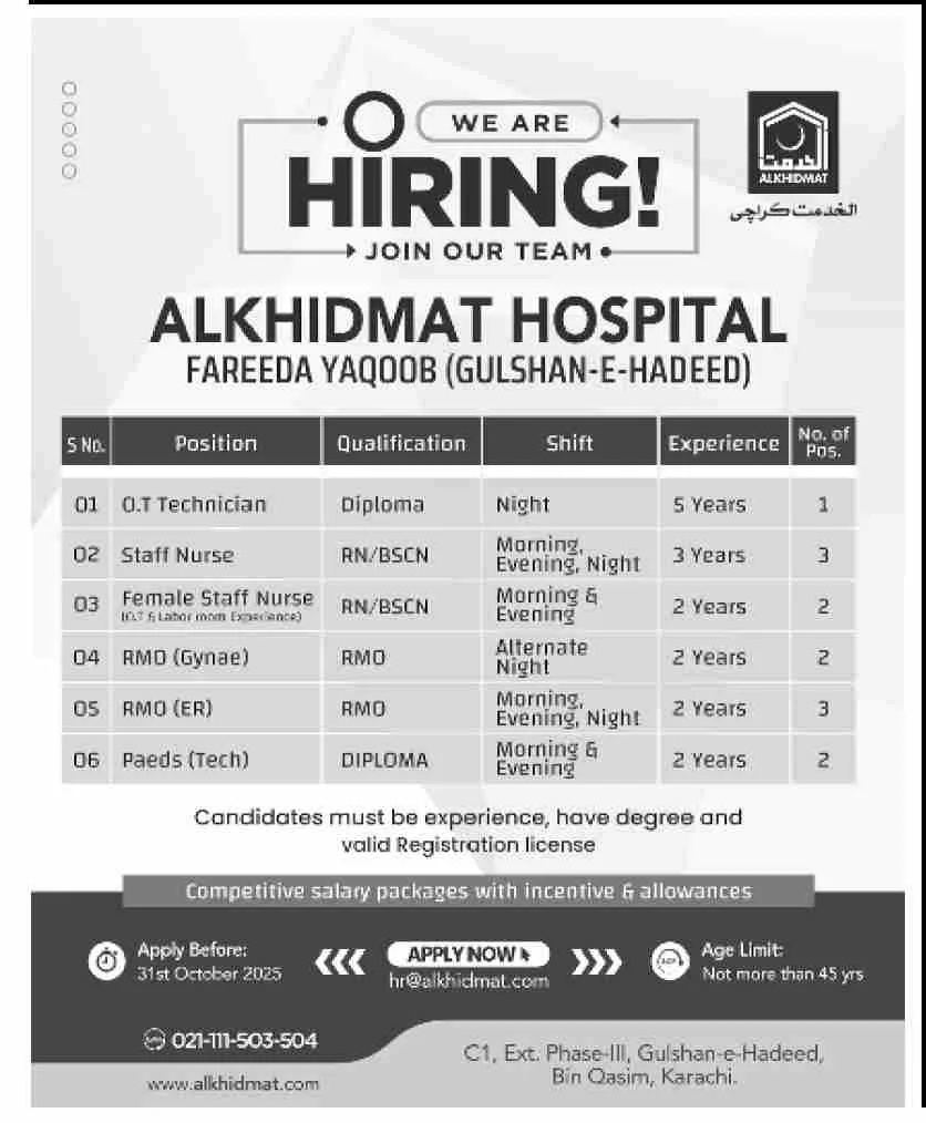 KARACHI – Alkhidmat Hospital Fareeda Yaqoob, located in Gulshan-e-Hadeed, is inviting applications from experienced and qualified healthcare professionals to join its dedicated team. The hospital has announced several vacancies across various departments, offering competitive salary packages with incentives and allowances.