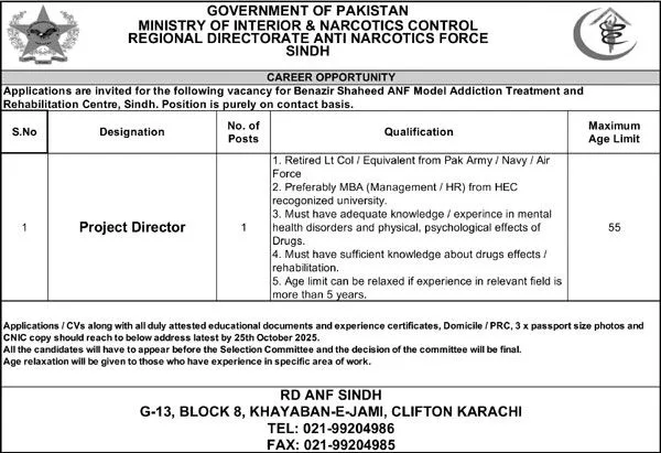 Are you a retired officer looking for a meaningful and high-impact career opportunity? The Ministry of Interior and Narcotics Control, under the Regional Directorate of the Anti Narcotics Force (ANF) Sindh, has announced a prestigious vacancy for the post of Project Director.