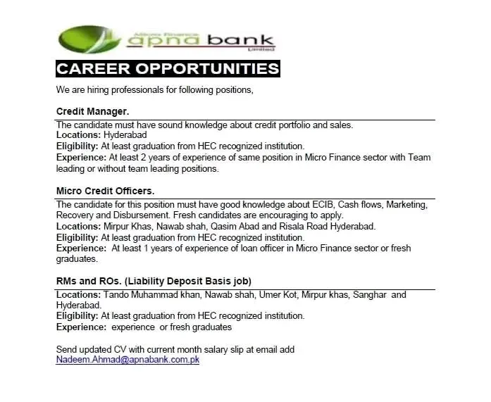 Apna Microfinance Bank Limited has announced multiple career opportunities for dedicated and skilled professionals looking to advance their careers in the banking sector. The bank is currently seeking to fill several key positions across various cities in Sindh, including Hyderabad, Mirpur Khas, and Nawab Shah. This is an excellent chance for both experienced individuals and fresh graduates to join a growing financial institution.