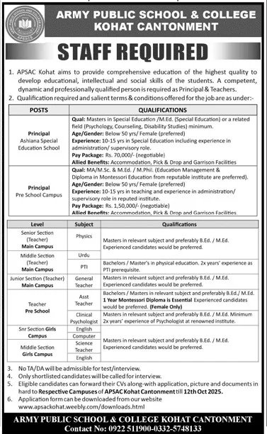 The Army Public School and College (APS&C) Kohat Cantonment has announced new career opportunities for teaching and administrative staff in 2025. APSAC Kohat aims to provide high-quality education that develops the intellectual, emotional, and social skills of students. The institution is now seeking qualified, dynamic, and competent professionals to join its teaching and management team.