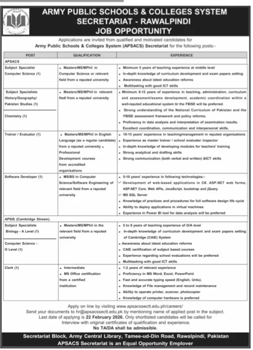 This article provides a comprehensive guide to the latest career opportunities announced by the Army Public Schools & Colleges System (APSACS) Secretariat Rawalpindi. If you are a qualified and motivated professional seeking a career in one of Pakistan’s most prestigious educational networks, this recruitment drive is for you.