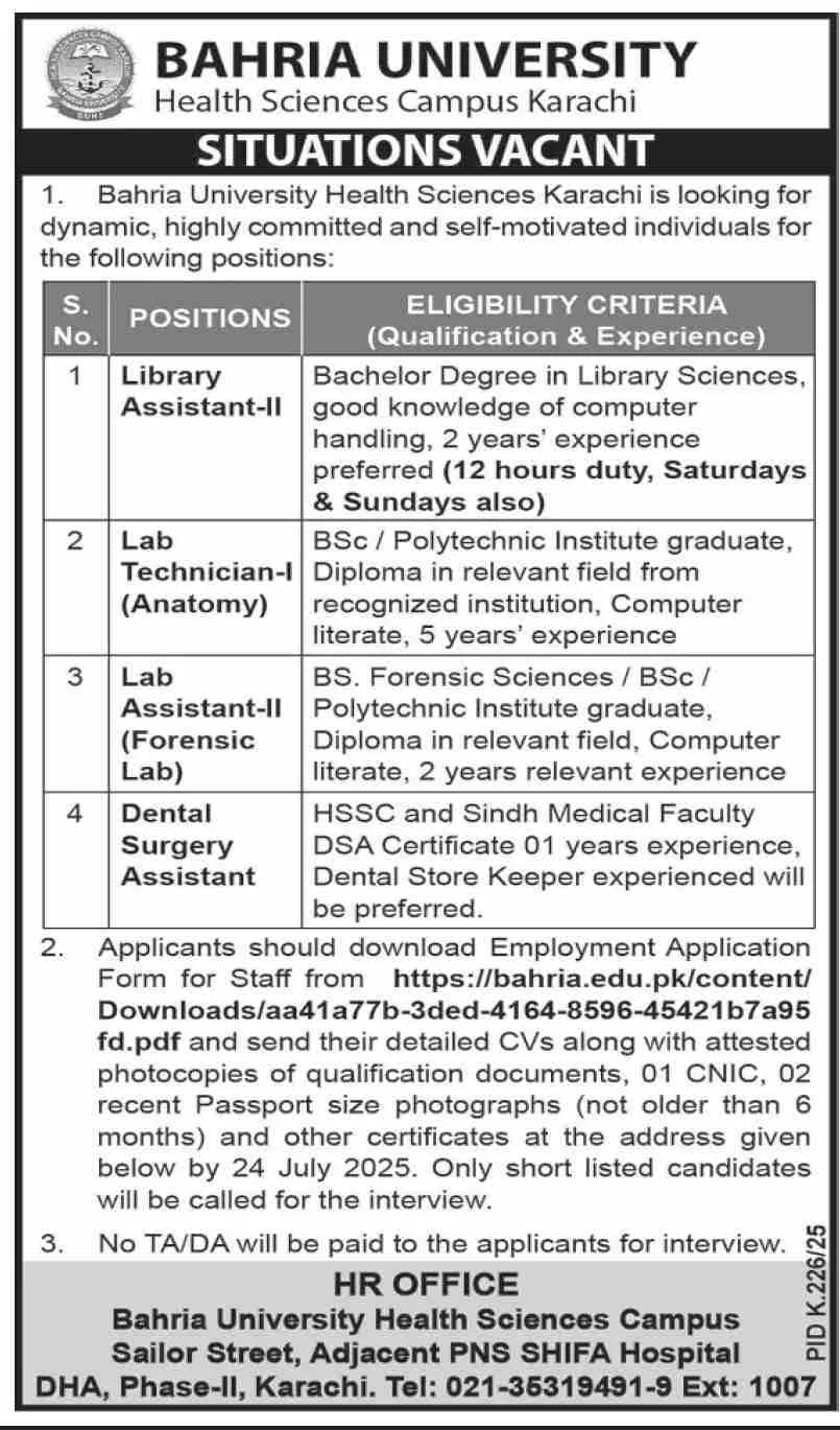 Bahria University jobs 2025, Health Sciences careers Karachi, Lab Technician anatomy, Forensic lab assistant, Dental surgery assistant, PNS Shifa hospital jobs, library sciences jobs, DHA Phase II careers.