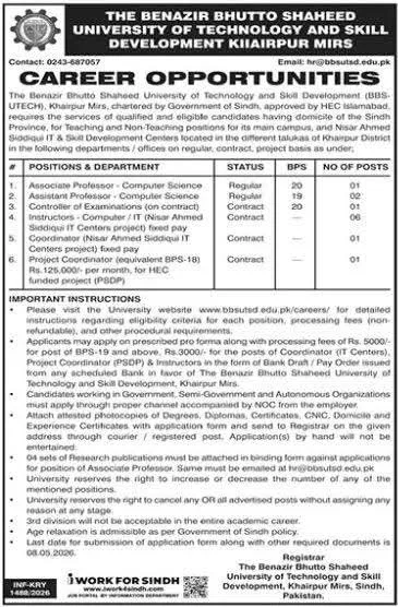 The Benazir Bhutto Shaheed University of Technology and Skill Development (BBS-UTECH), Khairpur Mirs, has announced several prestigious job opportunities for 2026. Chartered by the Government of Sindh and approved by HEC Islamabad, the university is seeking qualified professionals for its main campus and the Nisar Ahmed Siddiqui IT & Skill Development Centers across the Khairpur District.