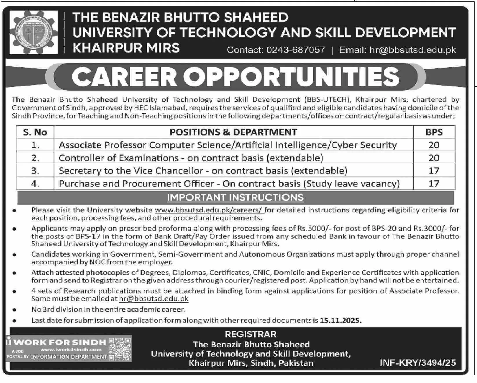 The Benazir Bhutto Shaheed University of Technology and Skill Development (BBSUTSD) Khairpur Mirs has announced new career opportunities for 2025. The university is inviting applications from qualified, experienced, and skilled professionals for various teaching and administrative positions on a contract or regular basis.