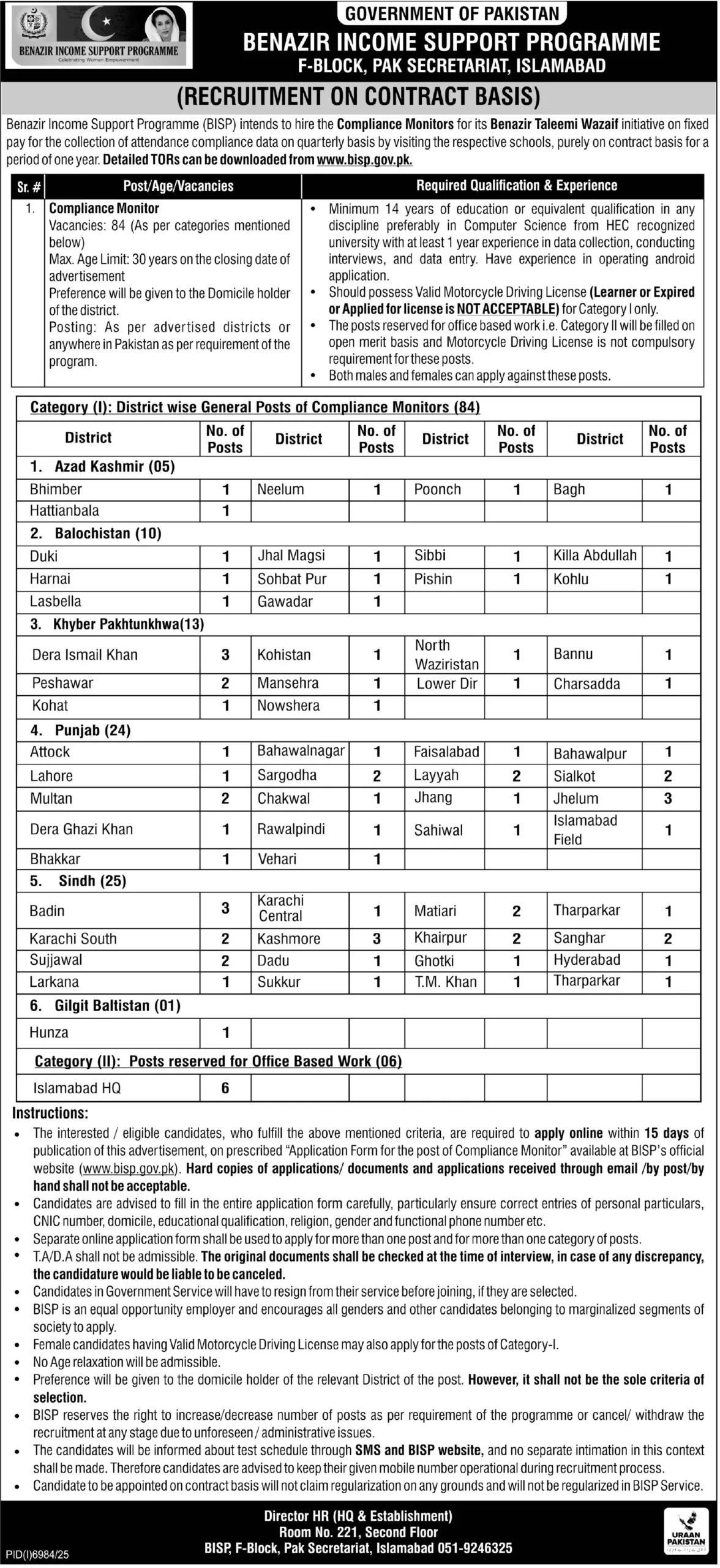 Benazir Income Support Programme BISP Compliance Monitor Jobs 2026