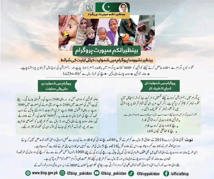 The Benazir Nashonuma Program is an initiative aimed at providing nutritional support. To benefit from this program, women must be regularly registered in the BISP Kafalat program and meet the following additional registration conditions: