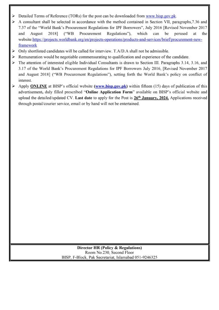 - Detailed Terms of Reference (TORs) for the post can be downloaded from www.bisp.gov.pk.
