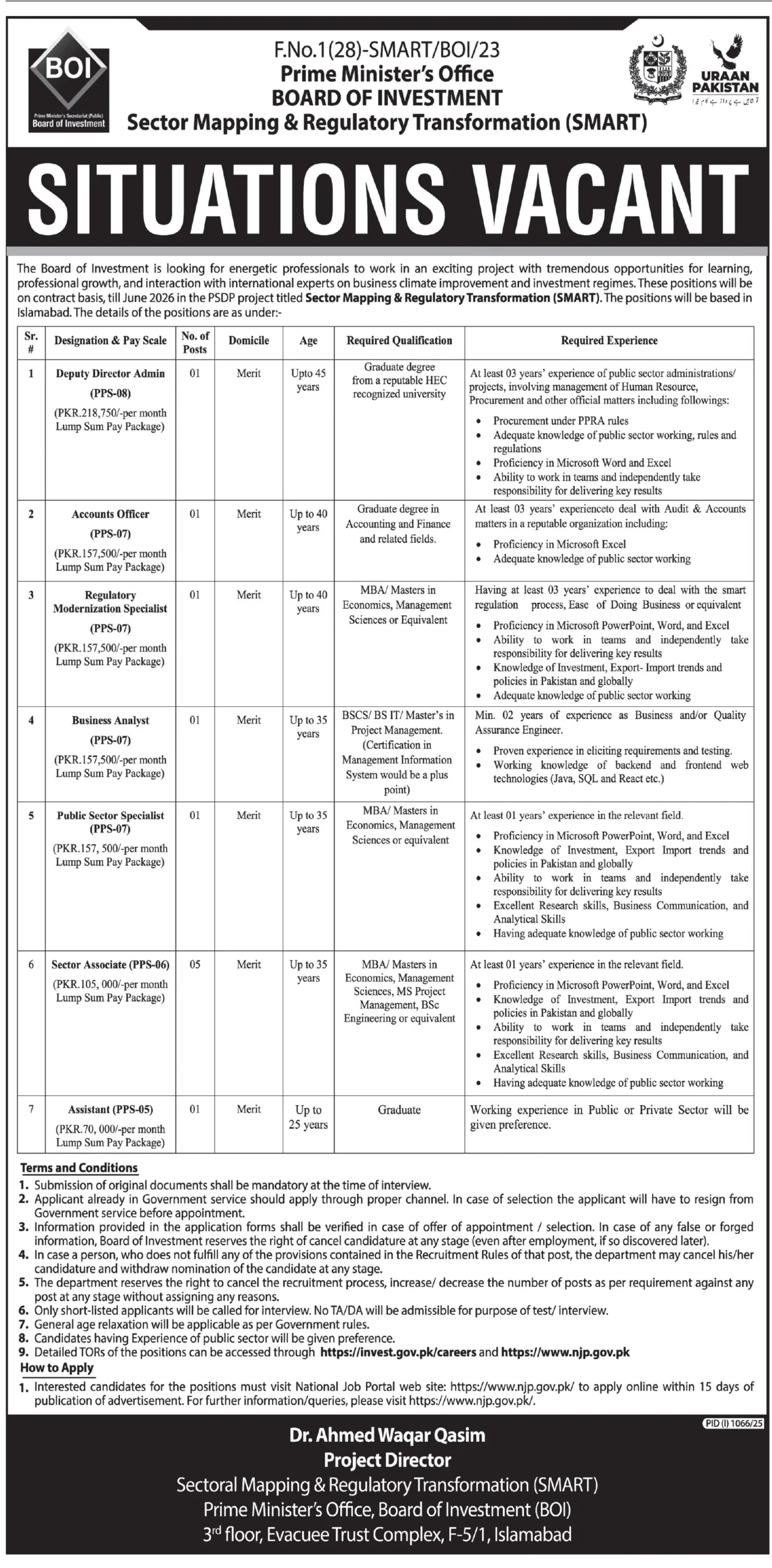 The Board of Investment (BOI), Government of Pakistan, is inviting applications from talented and motivated professionals for its “Sector Mapping & Regulatory Transformation (SMART)” project. These Islamabad-based positions offer an excellent opportunity to work in a dynamic environment focused on national economic growth.