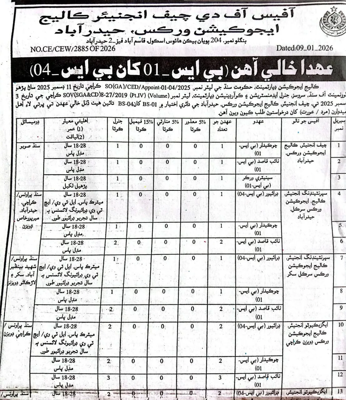 Sindh Government Jobs 2026: New Recruitment Drive for BPS-01 to BPS-04 at Chief Engineer College Education Works Hyderabad