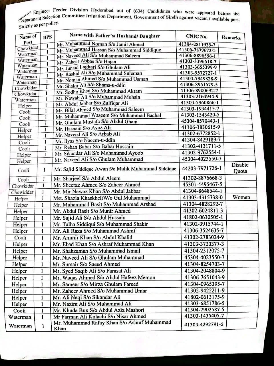 BPS 01 to BPS 4 Jobs Sindh List 2026 Apply Online The Sindh Government Irrigation Department has officially released the Final Selection List for candidates appointed to various BPS-01 (Basic Pay Scale-01) positions. These candidates were selected following an interview process conducted by the Departmental Selection Committee of the Irrigation Department for posts under the Executive Engineer Feeder Division, Hyderabad.