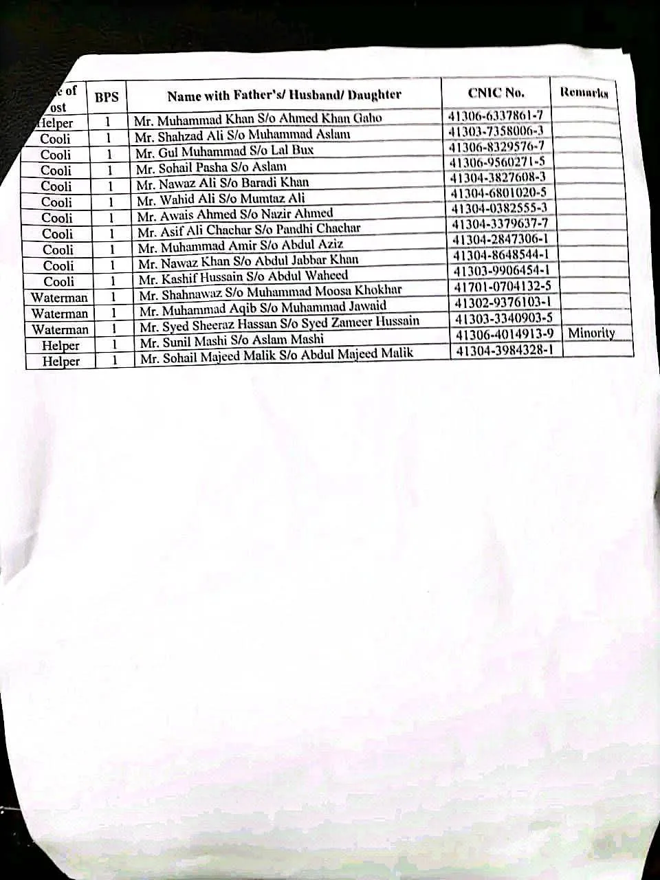 | Waterman | 1 | Mr. Muhammad Mubeen S/o Mossa Khokhar | 41701-0704132-5 | |