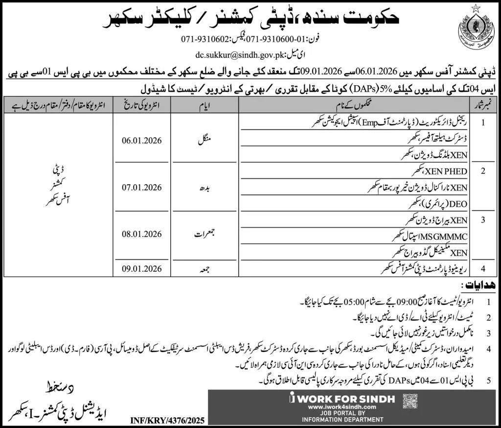 The Deputy Commissioner Office Sukkur has officially announced BPS 1 to BPS 4 Government Jobs 2026 for eligible candidates belonging to District Sukkur, Sindh. This recruitment drive is a golden opportunity for candidates seeking low-scale government jobs in Sindh under the Disabled Persons (DAPs) quota. According to the official advertisement, interviews will be conducted from 06 January 2026 to 09 January 2026 at the DC Office Sukkur.