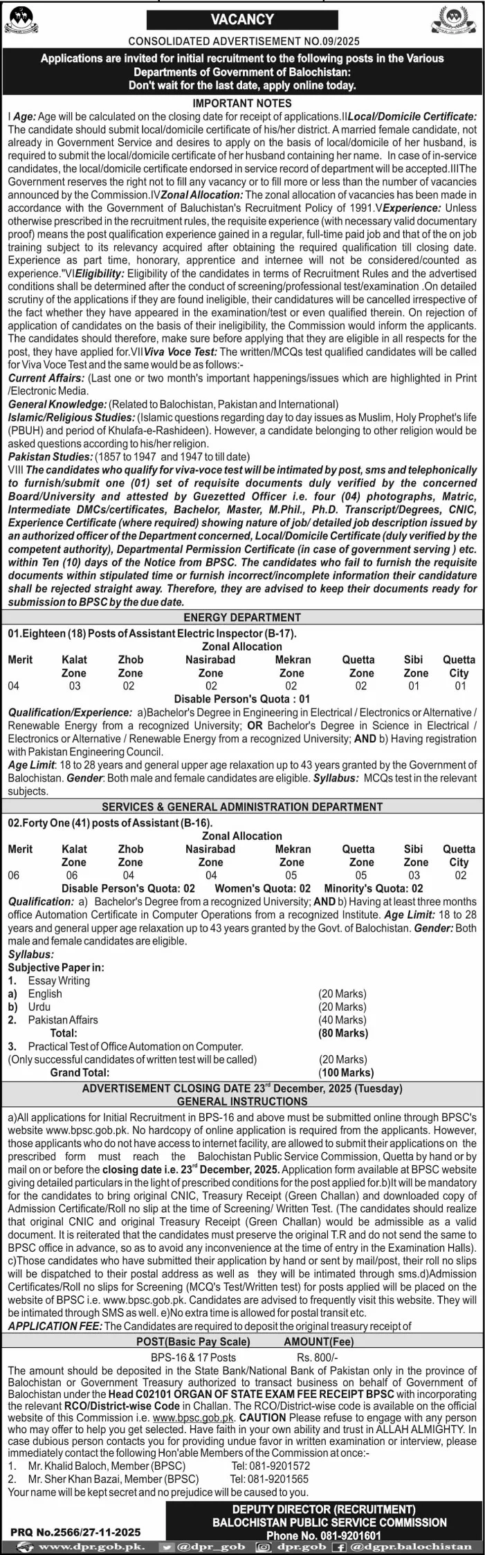 The Balochistan Public Service Commission (BPSC) has issued Consolidated Advertisement No. 09/2025, inviting applications for initial recruitment to various posts in BPS-16 and BPS-17 across the Government of Balochistan’s departments.