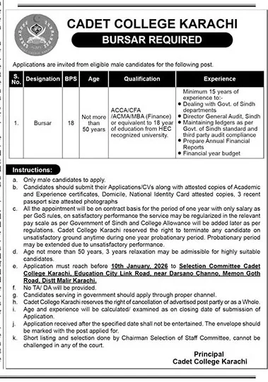Cadet College Karachi has officially announced a new career opportunity for experienced finance professionals under the title Bursar Jobs 2026. This recruitment drive invites applications from eligible male candidates who have strong academic backgrounds and proven expertise in financial management. The position offers a prestigious role within one of Sindh’s most reputable educational institutions.