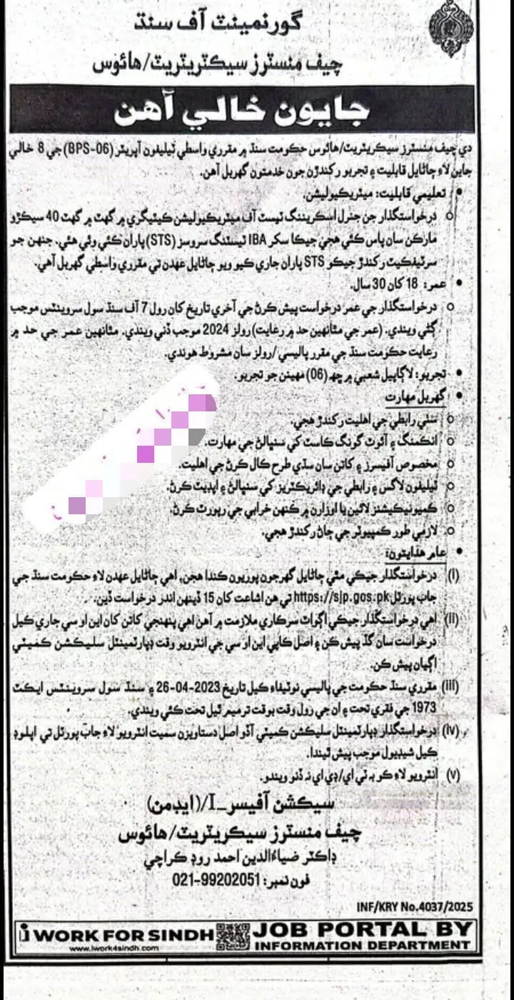 Government of Sindh: Chief Minister’s Secretariat/House – Telephone Operator Jobs 2025