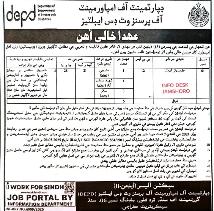 The Department of Empowerment of Persons with Disabilities (DEPD), Government of Sindh, is announcing a recruitment drive for 5 vacant posts of Computer Operator. Applications are invited from eligible candidates who hold a domicile of the Province of Sindh and meet the specialized educational requirements.