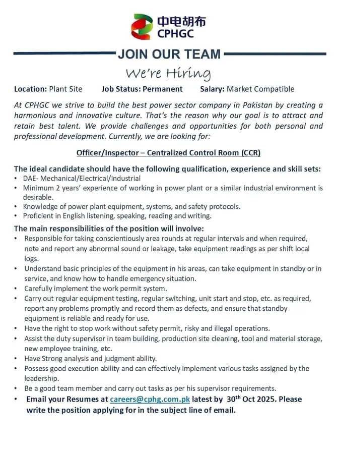 CPHGC is currently looking for skilled and dedicated individuals to fill the crucial position of Centralized Control Room (CCR) Officer. This role is integral to maintaining the efficiency and safety of our power plant operations.