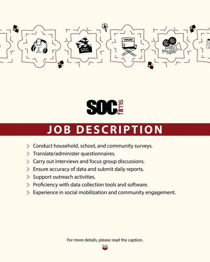 Interested applicants should email their CV and cover letter to jobs@socfilms.com. Please ensure the subject line clearly states: “Data Collectors”.