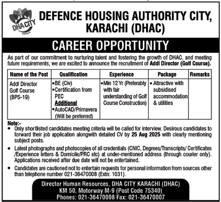 The Defence Housing Authority City, Karachi (DHAC) is seeking a seasoned professional to fill the role of Additional Director Golf Course (BPS-19). This presents a significant career opportunity for qualified individuals in the field of civil engineering.
