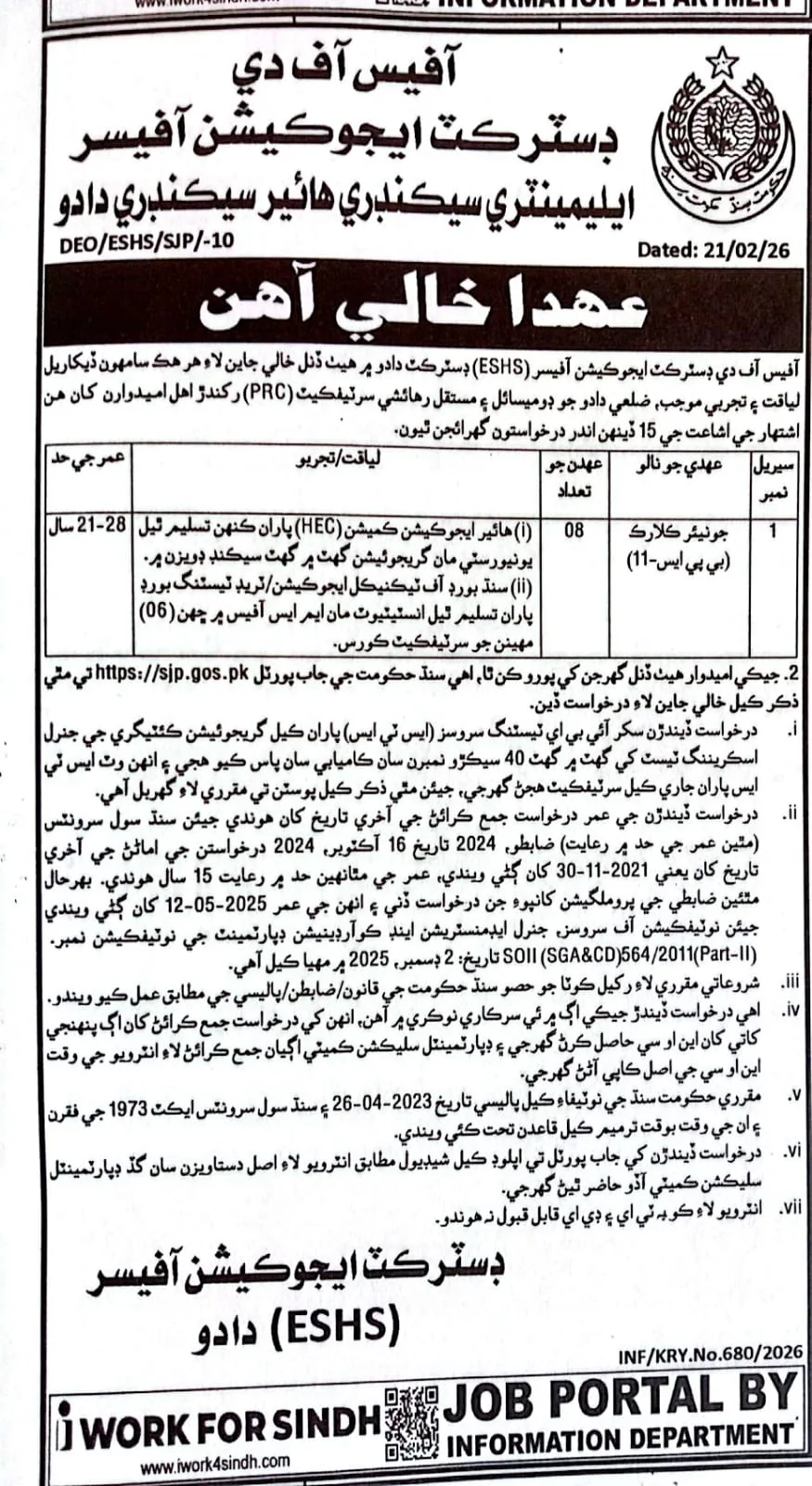 The School Education and Literacy Department, Government of Sindh, through the District Education Officer (ES&HS) Dadu, has officially announced new job vacancies for the post of Junior Clerk (BPS-11). These positions are offered on a regular basis for eligible male and female candidates who hold a permanent Domicile and PRC of District Dadu.