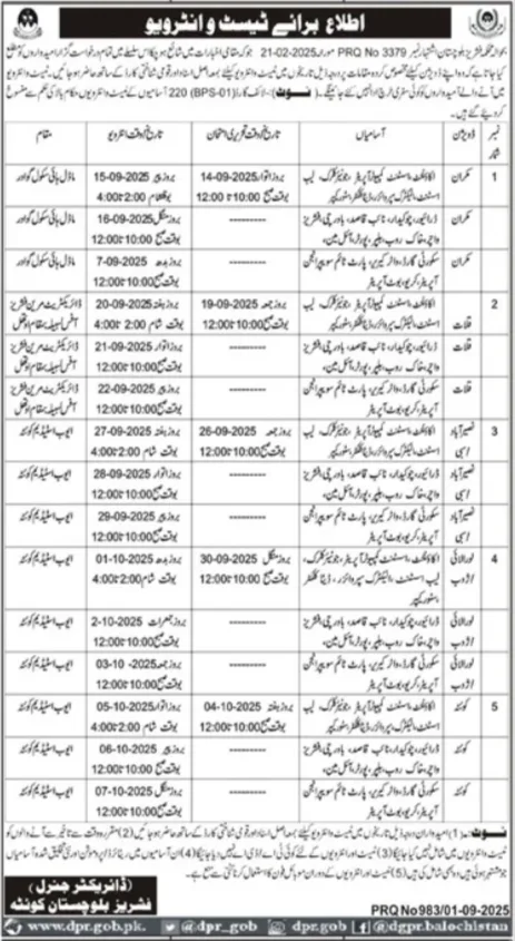 The Directorate General Public Relations (DGPR) Balochistan, Quetta, has officially released the schedule for written tests and interviews for the recruitment of 220 Naib Qasid (BPS-01) positions. This announcement, referenced under PRQ No. 3379, details the timeline for applicants across five divisions in the province. The recruitment process is set to take place from mid-September to early October 2025.