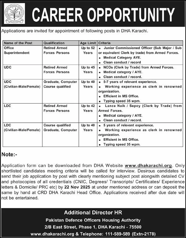 The Defence Housing Authority (DHA) Karachi has announced new career opportunities for retired armed forces personnel and qualified civilian candidates for multiple clerical and administrative posts. If you are looking for DHA Karachi Jobs 2025, Government Jobs in Karachi, or Armed Forces Retired Jobs, this guide provides complete details on eligibility, age limit, criteria, and application procedure.