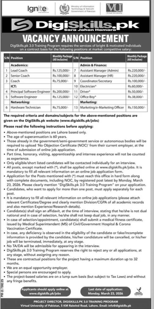 The DigiSkills.pk 3.0 Training Program, a flagship initiative of the Government of Pakistan managed by the Virtual University of Pakistan, has officially announced multiple job vacancies for its Lahore-based operations. These positions are offered on a contractual basis for a duration of up to 32 months, providing a stable and high-paying career path in the digital education sector.