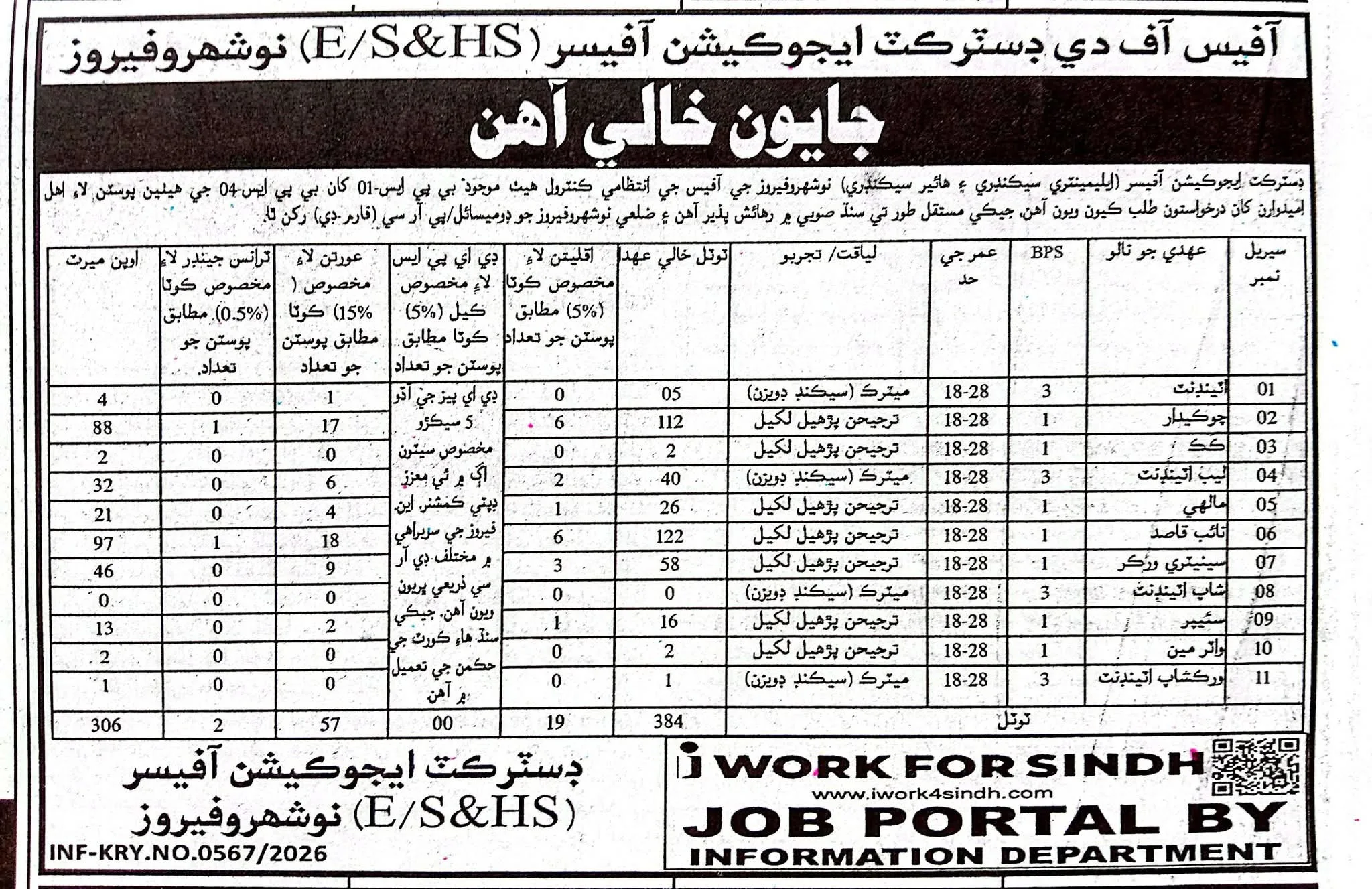 The School Education and Literacy Department, Government of Sindh, has officially announced over 384 new job vacancies through the office of the District Education Officer (Elementary, Secondary & Higher Secondary) Naushahro Feroze. These positions range from BPS-01 to BPS-03 and are open to candidates with a permanent Domicile and PRC of District Naushahro Feroze.