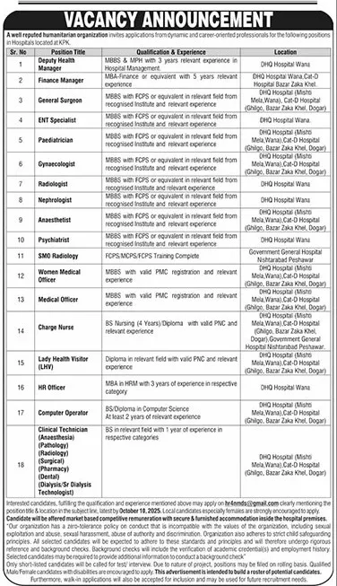 Healthcare is one of the most critical sectors in Pakistan, especially in underserved areas like Khyber Pakhtunkhwa (KPK). To improve access to quality medical services, a well-reputed humanitarian organization has announced multiple hospital job vacancies in KPK for 2025. These opportunities are available in District Headquarters (DHQ) Hospitals, Category-D Hospitals, and Government General Hospitals located in Wana, Zaka Khel, Ghilgo, Dogar, and Nisharabad Peshawar.