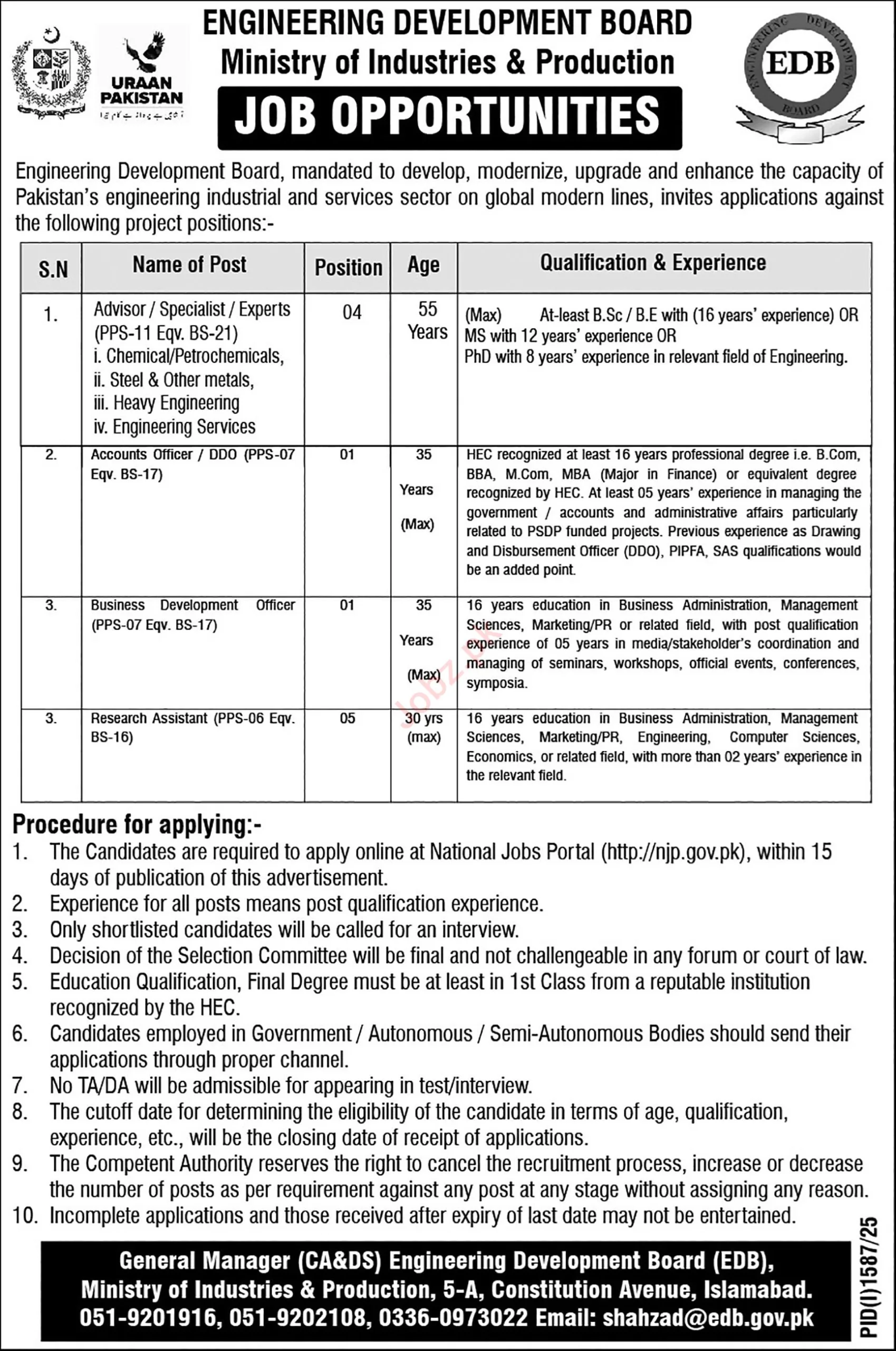 Working with the EDB means being at the forefront of policy-making and strategic development for one of Pakistan’s most critical economic sectors. The professionals selected for these roles will play a direct part in modernizing the country’s industrial landscape, enhancing its global competitiveness, and driving innovation.