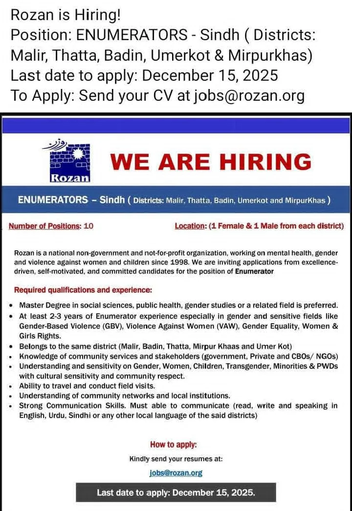 ISLAMABAD, Pakistan – Rozan, a leading national non-government and not-for-profit organization dedicated to mental health, gender, and violence against women and children since 1998, has announced an urgent recruitment drive for Enumerators in Sindh Province. This is a significant opportunity for passionate and committed individuals to contribute to vital social development work in the districts of Malir, Thatta, Badin, Umerkot, and Mirpurkhas.