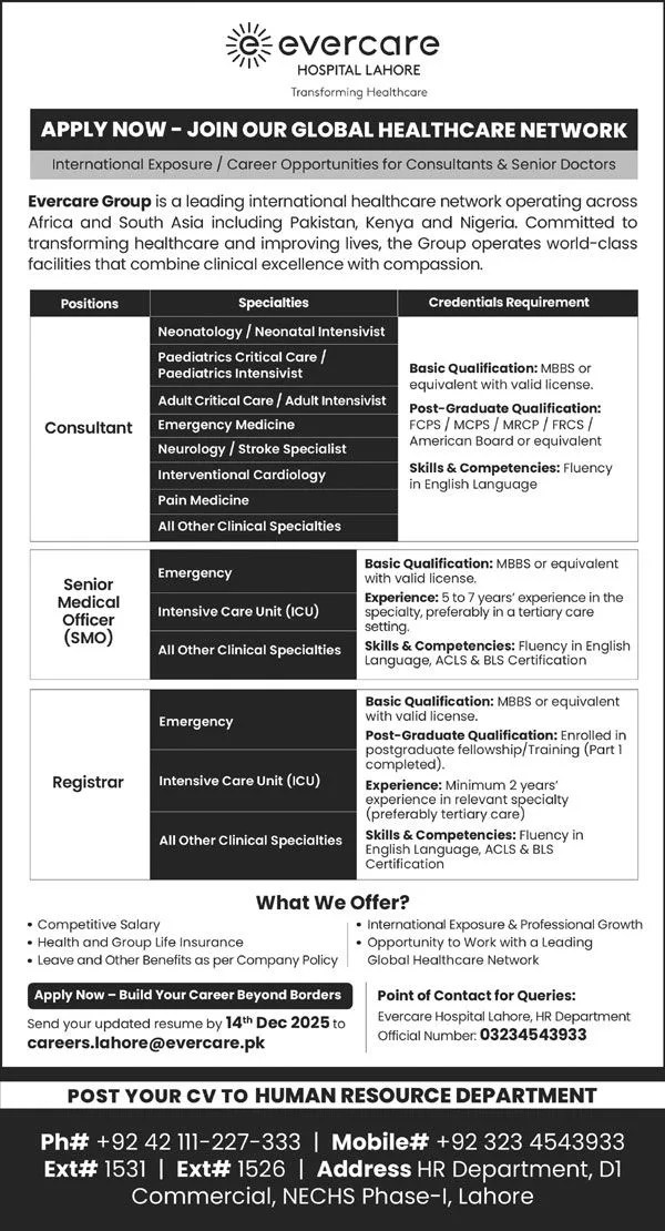 Lahore, Pakistan — December 2025: Evercare Hospital Lahore, part of the globally recognized Evercare Group, has officially opened applications for multiple senior-level medical positions. The hospital is seeking highly qualified Consultants, Senior Medical Officers (SMOs) and Registrars across a wide range of clinical specialties.