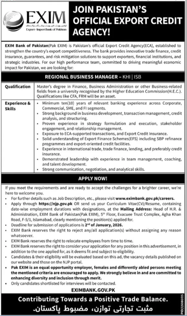 EXIM Bank of Pakistan Jobs 2026 Announced – Apply Now for Regional Business Manager Positions
