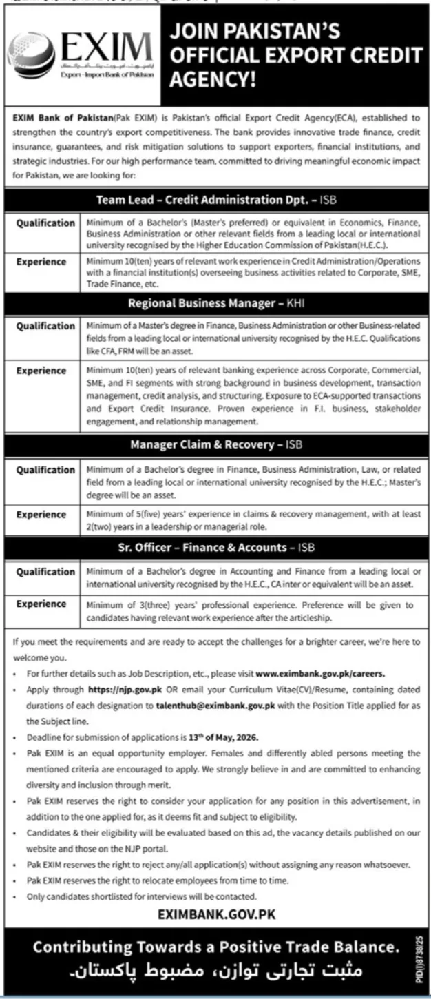 How to Apply: Apply through the National Job Portal (NJP) or email your CV to talenthub@eximbank.gov.pk.