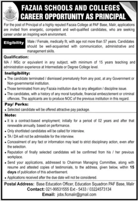 Fazaia Schools and Colleges has announced a prestigious career opportunity, inviting applications for the position of Principal at a highly reputed Fazaia College located at PAF Base, Malir. The institution is seeking an energetic, competent, and well-qualified leader who is looking to build a rewarding career in an inspiring and dynamic work environment.
