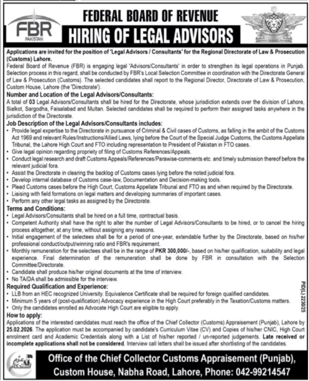 The Federal Board of Revenue (FBR) has officially announced vacancies for Legal Advisors / Consultants to strengthen its legal operations within the Punjab region. These high-paying positions are based at the Regional Directorate of Law & Prosecution (Customs), Lahore, covering a wide jurisdiction including Sialkot, Sargodha, Faisalabad, and Multan.