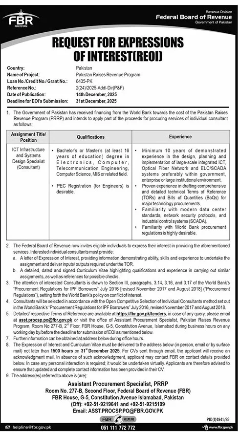 The Federal Board of Revenue (FBR), Government of Pakistan, has announced FBR Jobs 2026 under the Pakistan Raises Revenue Program (PRRP) 2026, a World Bank funded project. FBR invites qualified, experienced, and competent professionals to submit Expressions of Interest (EOI) 2026 for consultancy services on an individual basis.