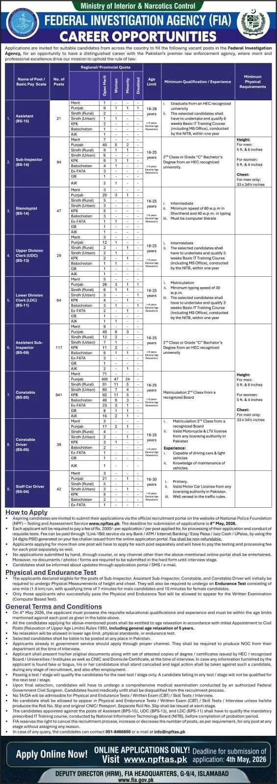 Keywords: FIA Jobs 2026, Federal Investigation Agency Recruitment, FIA Constable Jobs, Apply Online FIA, npftas.pk, Sub-Inspector jobs Pakistan, ASI careers, Pakistan Police Jobs.
