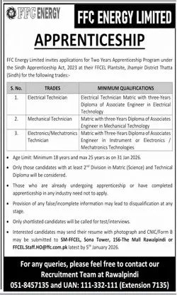 FFC Energy Limited has announced a Two-Year Apprenticeship Program under the Sindh Apprenticeship Act, 2013 at its FFC Energy Plant Site, Jhampir District Thatta (Sindh). Applications are invited from suitable and motivated candidates to apply for the following trades.