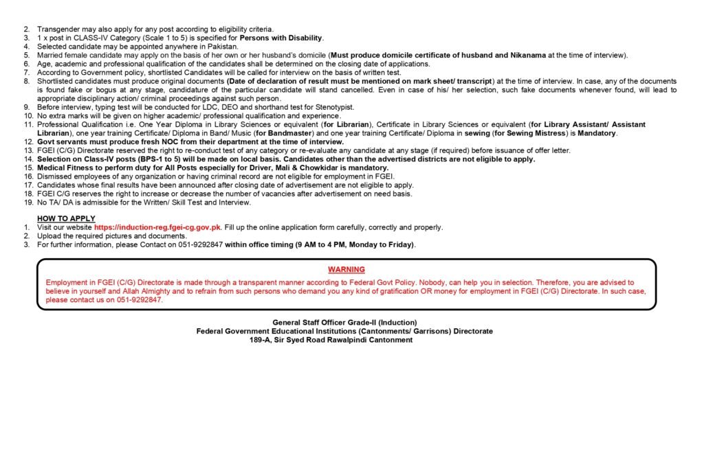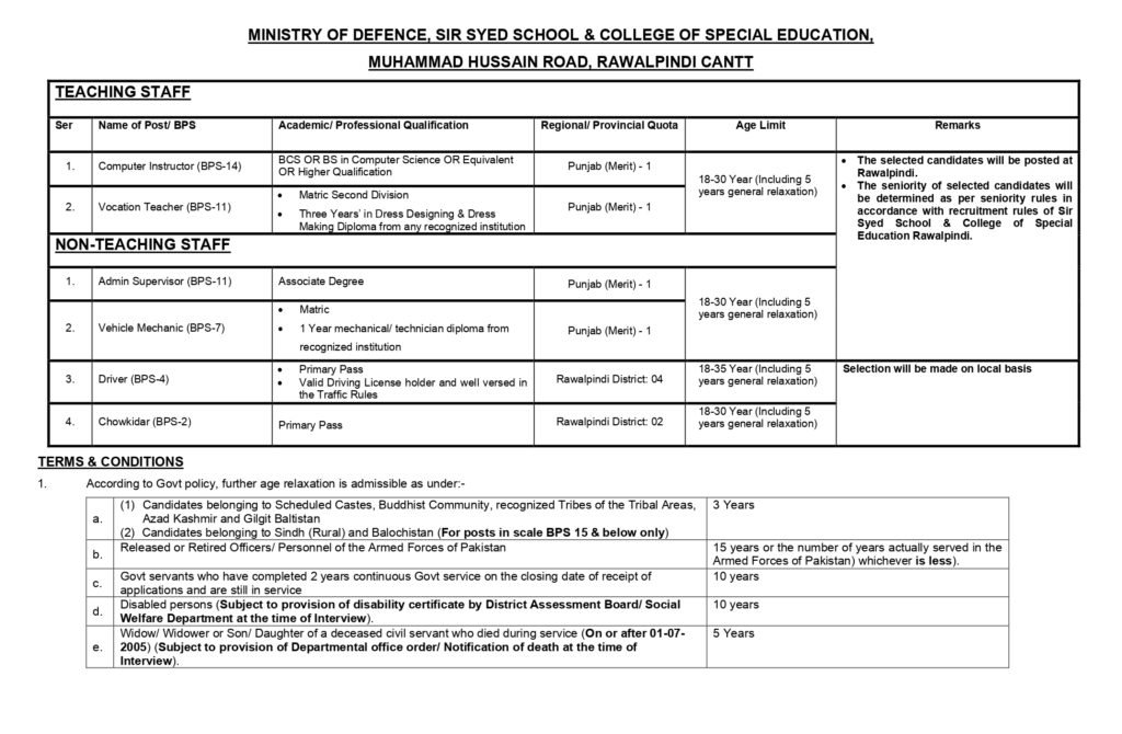 The Ministry of Defence, Federal Government Educational Institutions (Cantonments/ Garrisons) Directorate, situated at Sir Syed Road, Rawalpindi Cantonment, invites online applications for the recruitment of teaching and non-teaching staff. This recruitment drive is open for various posts ranging from BPS-1 to BPS-15, across the Directorate, Regional Offices, and its Institutions.