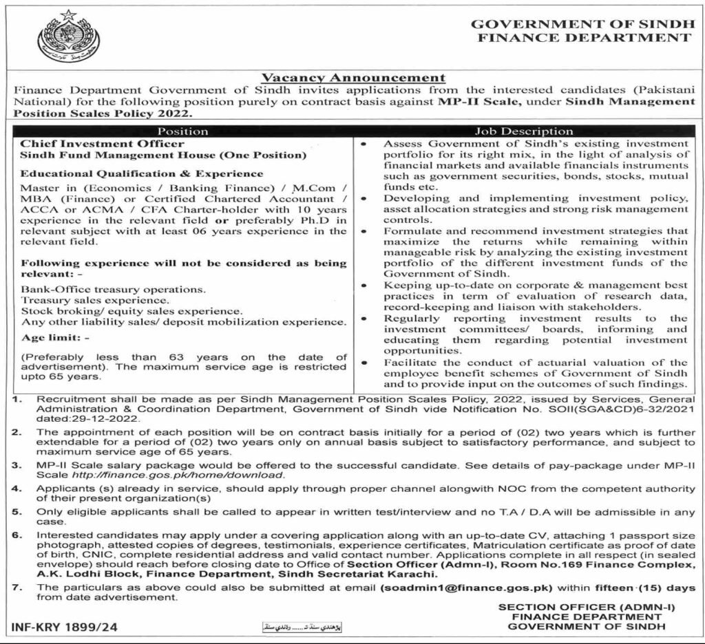 The Finance Department, Government of Sindh is inviting applications from qualified and experienced professionals for the position of Chief Investment Officer at the Sindh Fund Management House. This position is offered on a contract basis under the Sindh Management Position Scales Policy 2022, with an MP-II Scale package. Here are the details: