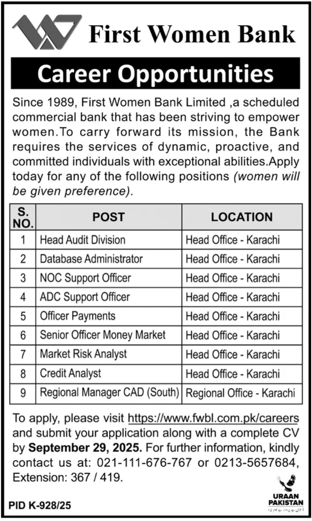 The latest First Women Bank jobs 2025 offer multiple exciting positions at the Head Office and Regional Office in Karachi. These positions are open to both male and female candidates, but preference will be given to women applicants in line with FWBL’s mission of women empowerment.