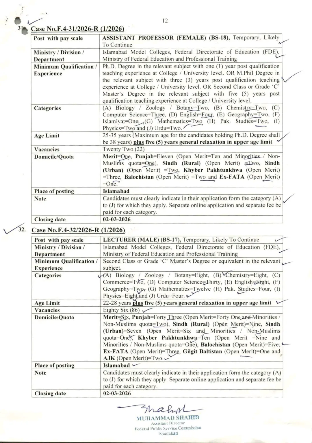 • Assistant Professor (BS-18): Over 30 positions for male and female PhD/M.Phil candidates in subjects like Biology, Chemistry, and IT.